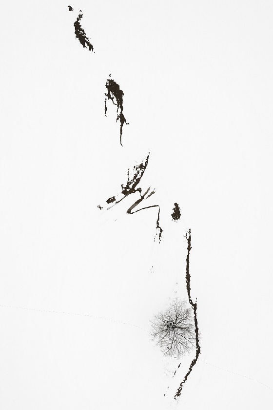 | Ses photographies s’inscrivent dans la lignée de Edward Burtyinsky, George Gerster, George Steinmetz et Yann Arthus-Bertrand mais – bien que son travail s’apparente au leur pour la méthodologie, la composition, les sujets, une exploration de la nature modifiée par la présence humaine et une dévotion à l’écologie – Kowalski a rapidement développé son propre langage visuel. Il shoote à la verticale absolue, à une hauteur de 150m, aplatissant la perspective et créant des images évoquant des tableaux contemporains. Les lignes démarquant les différents éléments du paysage, précises et irrégulières, nous font penser aux mots de Gaudi : « Il n’y a pas de ligne droite ou d’angles aigus dans la nature ». Comme les coups de pinceau de Soulages, les compositions hivernales de Kowalski, pratiquement monochromatiques, révèlent la beauté géométrique abstraite d’une structure figée lors du mouvement.