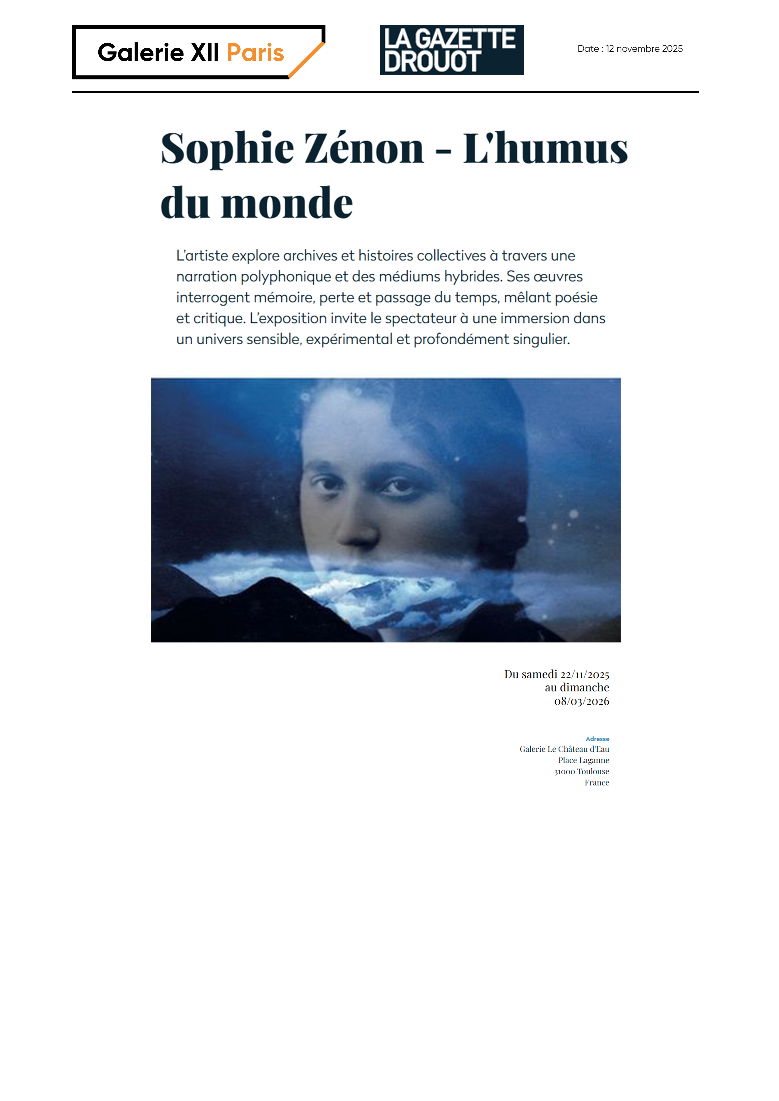 Sophie Zénon articulates her work around recurring themes - memory, history, loss, the passage of time. She creates bridges between intimate and patrimonial history, where the present is a vessel for accumulated time and history that she crystallizes through trace, metaphor and the marvelous. Photographs, reactivated archives, artist's books, videos, installations, as well as glass engravings, monotypes, woven and modeled prints... Her work unfolds in a polyphonic narrative, revealing the important place the artist bestows to experimentation, materiality and the hybridization of media. Her work is organic, vibrant and poetic, guided by notions of fragility, impermanence and the breath of life. Since 2000, her work has been exhibited in Europe as well as internationally in prestigious venues (Palais de Tokyo, BNF, Mobilier national, galerie Thessa Herold, Fondation Pierre Bergé / YSL, Fondation Fernet-Branca, Fondation François Schneider, Le Houston Center for Photography) and has entered public collections and numerous private collections.Sophie Zénon has received several awards, including the creation grant of the Fondation des Artistes (2022), the Prix Eurazeo (2019), the Prix de la Fondation des Treilles (2015), the Prix Kodak de la Critique (1999), and was a finalist for the Villa Kujoyama in 2023. In February 2024, Sophie Zénon was designated as a laureate by the French Ministry of Culture to celebrate the 30th anniversary of the "maîtres d'art / élèves" program, for her visual art project based on gesture and know-how, which she will produce using ante-digital processes.