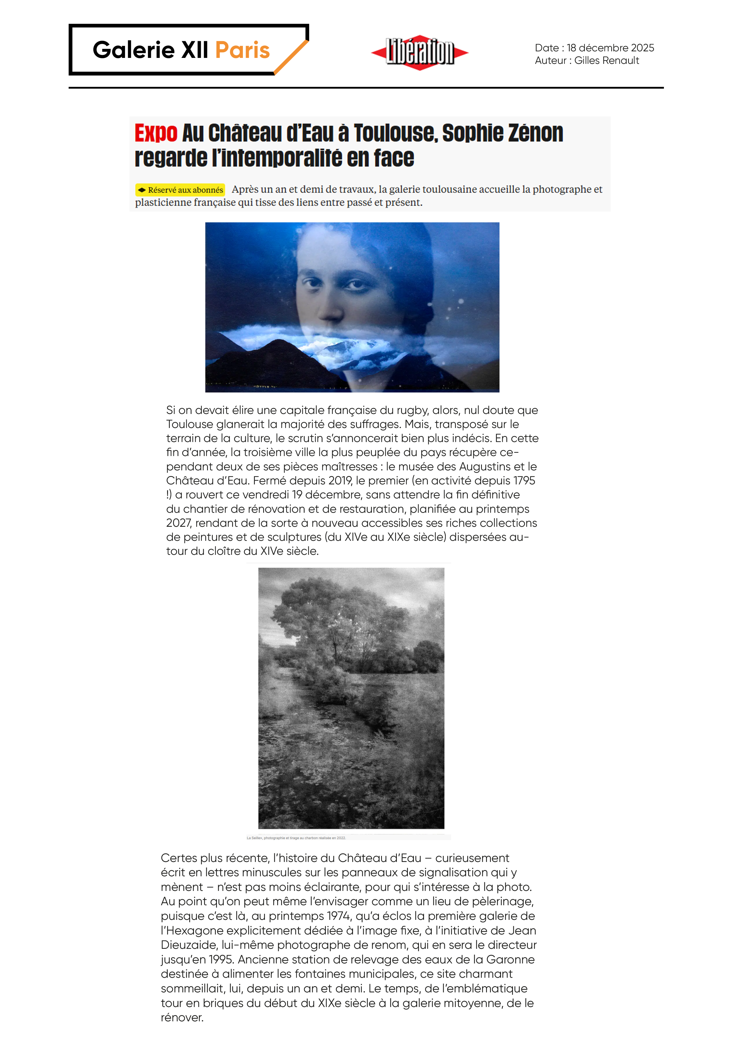 Sophie Zénon articulates her work around recurring themes - memory, history, loss, the passage of time. She creates bridges between intimate and patrimonial history, where the present is a vessel for accumulated time and history that she crystallizes through trace, metaphor and the marvelous. Photographs, reactivated archives, artist's books, videos, installations, as well as glass engravings, monotypes, woven and modeled prints... Her work unfolds in a polyphonic narrative, revealing the important place the artist bestows to experimentation, materiality and the hybridization of media. Her work is organic, vibrant and poetic, guided by notions of fragility, impermanence and the breath of life. Since 2000, her work has been exhibited in Europe as well as internationally in prestigious venues (Palais de Tokyo, BNF, Mobilier national, galerie Thessa Herold, Fondation Pierre Bergé / YSL, Fondation Fernet-Branca, Fondation François Schneider, Le Houston Center for Photography) and has entered public collections and numerous private collections.Sophie Zénon has received several awards, including the creation grant of the Fondation des Artistes (2022), the Prix Eurazeo (2019), the Prix de la Fondation des Treilles (2015), the Prix Kodak de la Critique (1999), and was a finalist for the Villa Kujoyama in 2023. In February 2024, Sophie Zénon was designated as a laureate by the French Ministry of Culture to celebrate the 30th anniversary of the "maîtres d'art / élèves" program, for her visual art project based on gesture and know-how, which she will produce using ante-digital processes.