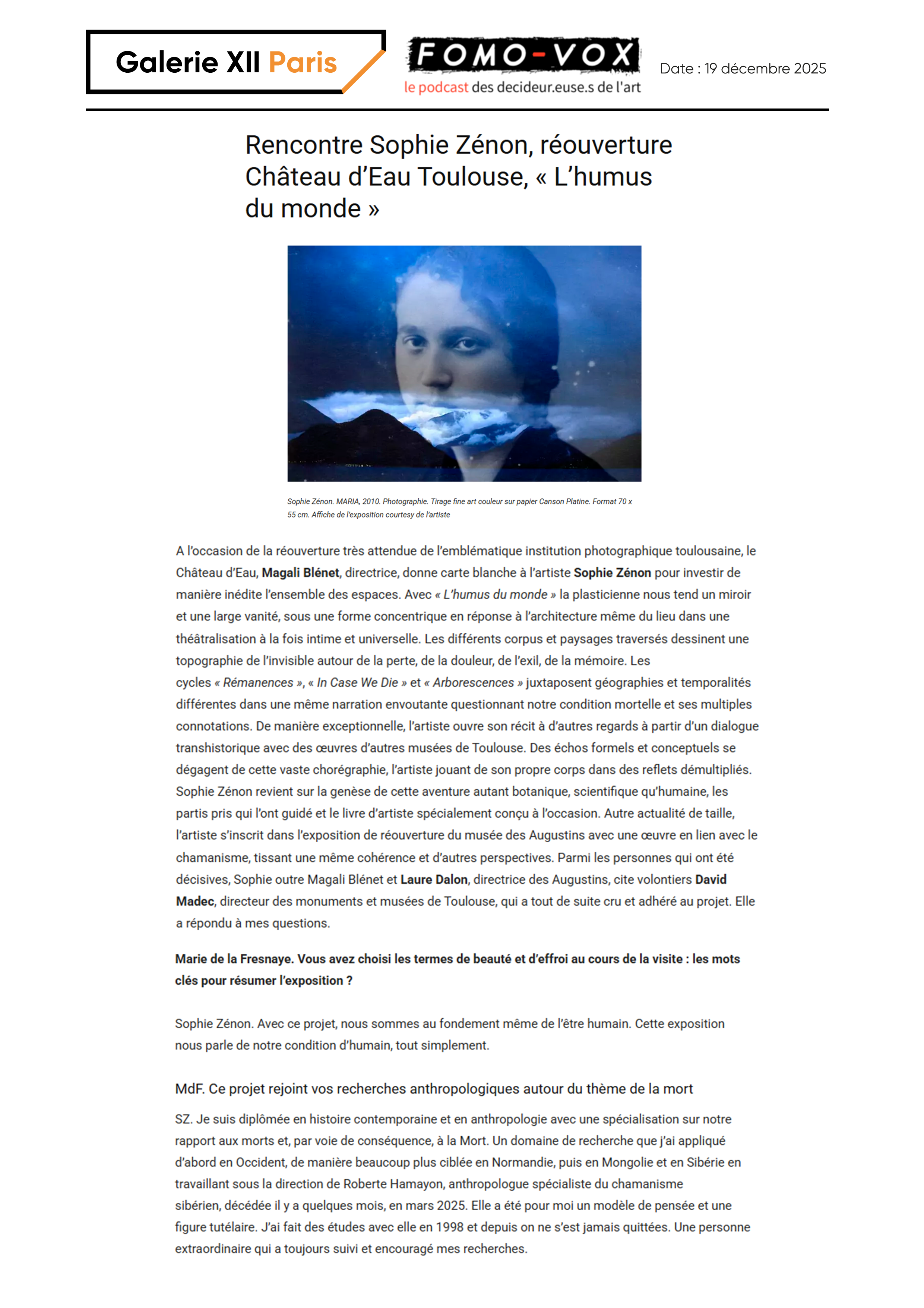 Sophie Zénon articule son oeuvre autour de thèmes récurrents – la mémoire, l’histoire, la perte, le passage du temps – et crée des ponts entre histoire intime et patrimoniale, où le présent est un réceptacle de temps et d’histoires accumulées qu’elle cristallise par la trace, la métaphore et le merveilleux. Photographies, archives réactivées, livres d’artiste, vidéos, installations, mais aussi gravures sur verre, monotypes, estampages tissés et modelés... Son oeuvre se déploie en une narration polyphonique, révélant la place importante que l’artiste accorde à l’expérimentation, à la matérialité et à l’hybridation des médiums. De sa pratique naissent des oeuvres organiques, vibrantes et poétiques, guidées par les notions de fragilité, d’impermanence et de souffle de vie. Depuis l’an 2000, ses oeuvres sont exposées en Europe et à l'international dans des lieux prestigieux (Palais de Tokyo, BNF, Mobilier national, galerie Thessa Herold, Fondation Pierre Bergé / YSL, Fondation Fernet-Branca, Fondation François Schneider, Le Houston Center for Photography) et ont intégré des collections publiques et de nombreuses collections privées. Sophie Zénon a obtenu plusieurs reconnaissances dont le soutien à la création de la Fondation des Artistes (2022), le Prix Eurazeo (2019), le prix de la Fondation des Treilles (2015), le prix Kodak de la Critique (1999) et a été finaliste en 2023 de la Villa Kujoyama. Valorisant par ailleurs les métiers d’art depuis plus de vingt ans, Sophie Zénon a été nommée en février 2024 lauréate de la commande du Ministère de la Culture portant sur les 30 ans du dispositif maîtres d’art / élèves pour un projet plastique autour du geste et des savoir-faire qu’elle réalisera avec des procédés anté-numériques.