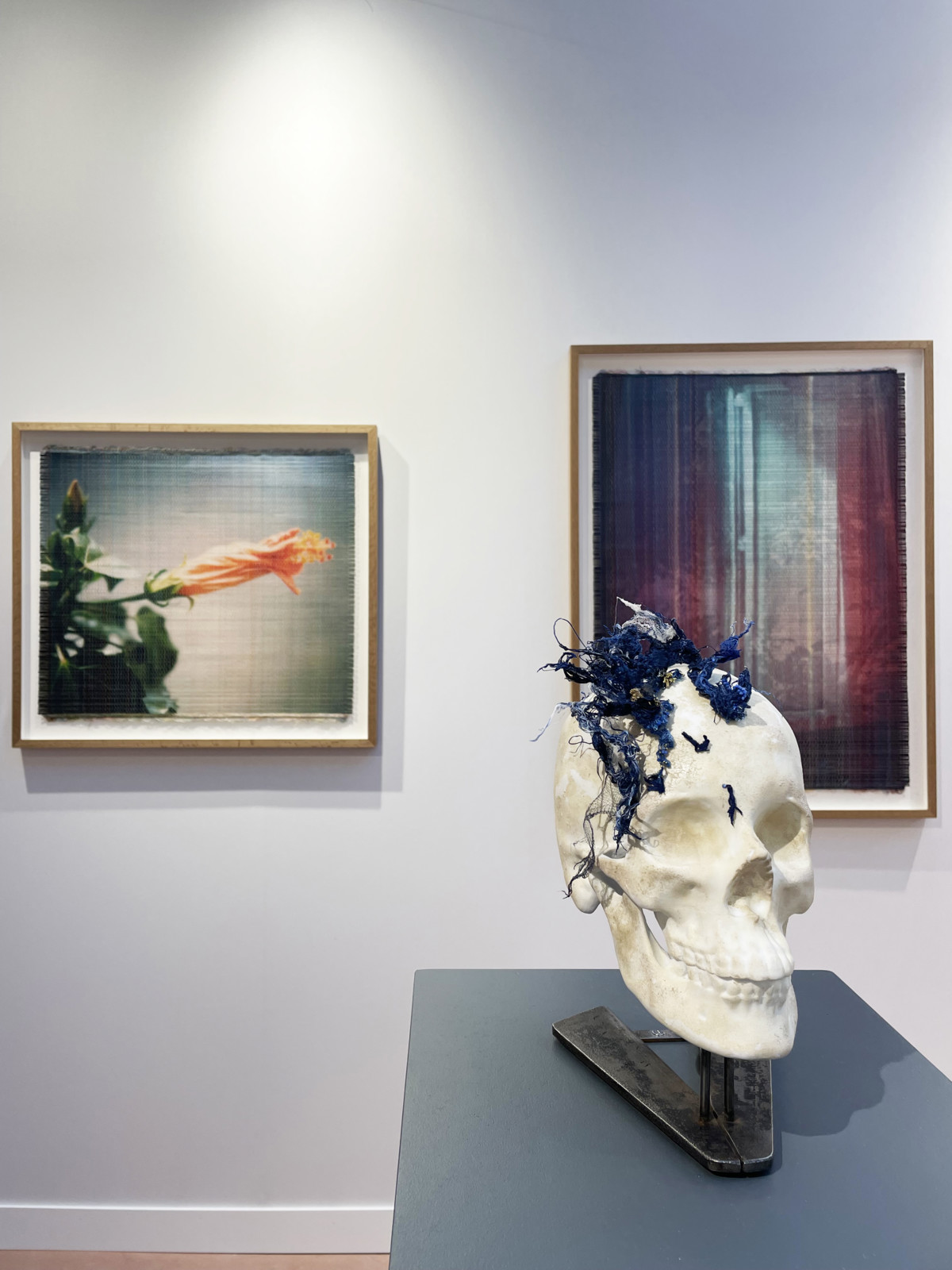 De façon introspective et sensorielle, Susanne Wellm fait s’entrechoquer mondes intérieurs, fictions et réalités. Des œuvres hybrides réunissant bandes de papier photographique et fils de coton sur un métier à tisser.